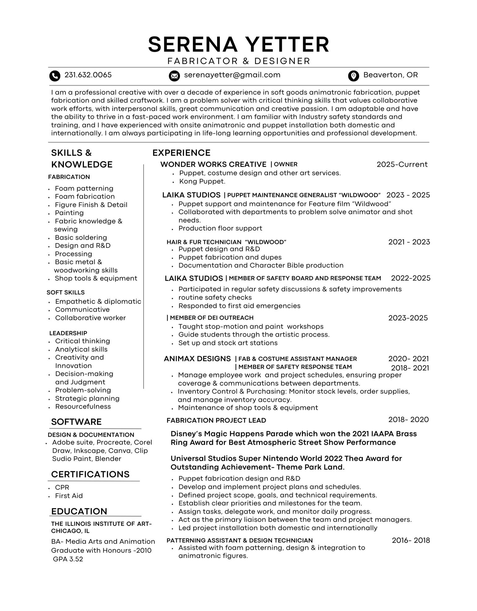 Fabricator, puppet designer and Illustrator.I have had over a decade long career in themed entertainment and stop-motion film. I have both lead and been apart of teams that contributed puppets and animatronics to award winning attractions around the world. Such notable projects include Pepita from Disney’s Magic Happens Parade and Universal Studios Super Nintendo World.
